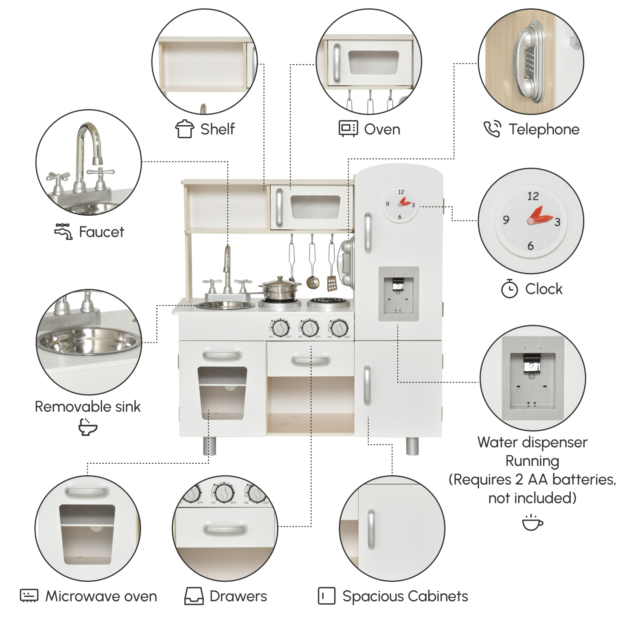 - Interactive sink, induction cooker, telephone and water dispenser for extra fun and realism